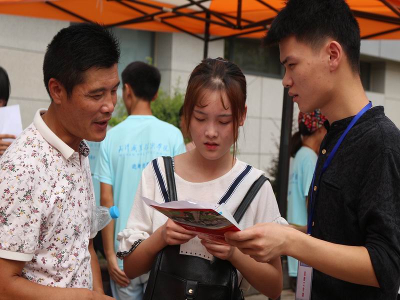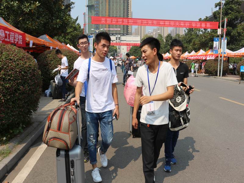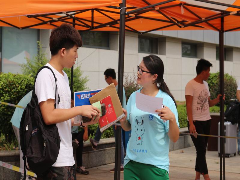 志愿者们热情大方地接待每一名新生及家长,主动为新生指引食堂、银行、日用品超市的位置,介绍校园生活和周边环境。“请问电信学院在哪里报到?”、“东九宿舍怎么走?”、“绿色通道在哪里办理?”、“这个专业难不难学?”……他们认真细致地解答新生及家长关于报到流程、报到地点、学费缴纳、宿舍安排、被服领取等各类问题。