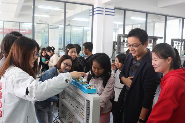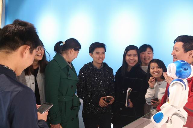 座谈之后,缅甸留学生到第一工业中心实地参观电工实训室、通信网络实训室、光传输实训室、通信工程实训室、网络优化技术实训室、物联网实训室、物联网体验中心、机器人实训室等。参观过程中,留学生们通过专业老师蔡渤流利的英语讲解,进一步了解了电信学院通信技术专业的发展规划和教学环境。留学生们对机器人表现出了极大的兴趣,切身体验到科技的神奇力量。高端大气的实训室、激情澎湃的授课老师、跃跃欲试的同学、浓厚的学习氛围立刻把这些留学生吸引住了,他们感叹:这样的环境实在太棒了,在这里学习可真是一种享受!