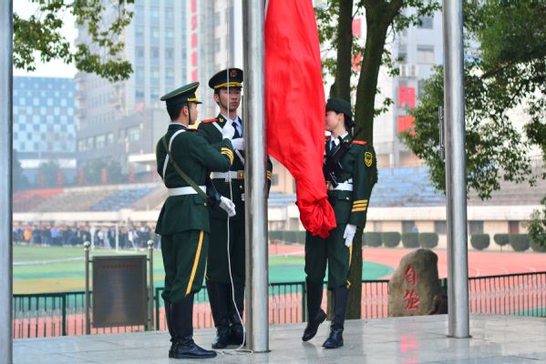 6点半,参与人员准备就位,现场随着仪仗队的出现而安静下来。庄严的仪仗队队员们迈着整齐的步伐,护送国旗入场,伴着庄严嘹亮的国歌,五星红旗冉冉升起,全体师生怀着崇敬与喜悦的心情,凝视着迎风飘扬的五星红旗,心中无比自豪。