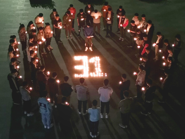 19时30分,电制17301班王梓俊带领大家重温了英雄事迹。随后,全体学生肃立,并在凌曦楼下围成一圈,点燃蜡烛,为牺牲的31名消防员默哀3分钟,沉痛悼念守卫家园的英雄。