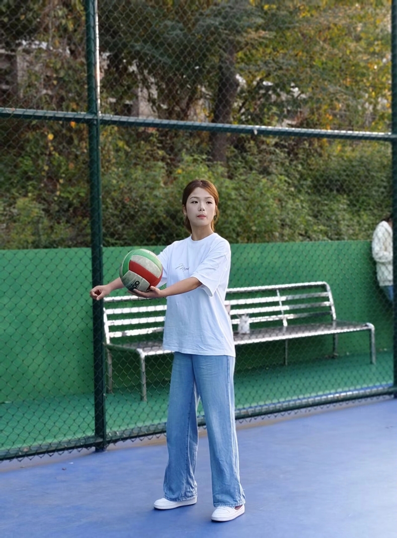 干雨露与排球的缘分,始于一次意外的尝试。大一刚入学时,她看到学院女排招募新队员的通知,尽管从未接触过排球,仍抱着“试一试”的心态报了名。训练第一天,她的发球屡屡失败,接球也手忙脚乱,但她没有退缩。每天清晨6时30分,她准时出现在球场,独自练习发球和垫球;晚上下课后,又与队友加练战术配合,一次次磨合,逐渐找到了比赛的节奏。