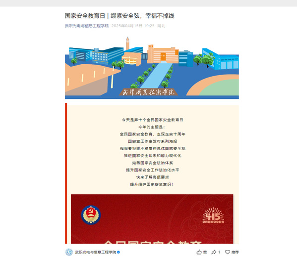 新闻网讯(通信员 史可)春深四月,国家安全教育在光电与信息工程学院掀起一场科技与思政深度融合的育人热潮。围绕“贯彻总体国家安全观,增强全民国家安全意识和素养”主题,学院立足光电信息学科优势,面向全体师生开展沉浸式、专业化、青年化的国家安全教育活动,累计覆盖师生1500余人,在润物细无声中筑牢了新时代“安全底座”,书写出“三全育人”协同育人的新答卷。
