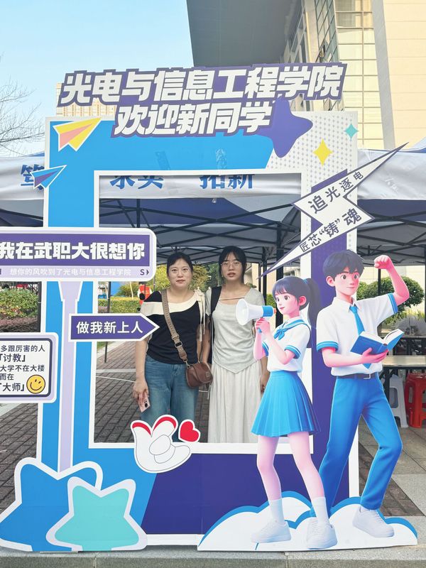 “咔嚓!”光信25402班的林同学与母亲在打卡点拍下了一张全家福。“这张照片将成为我大学的第一份记忆,从此刻开始,记录我的成长与蜕变。”林同学说